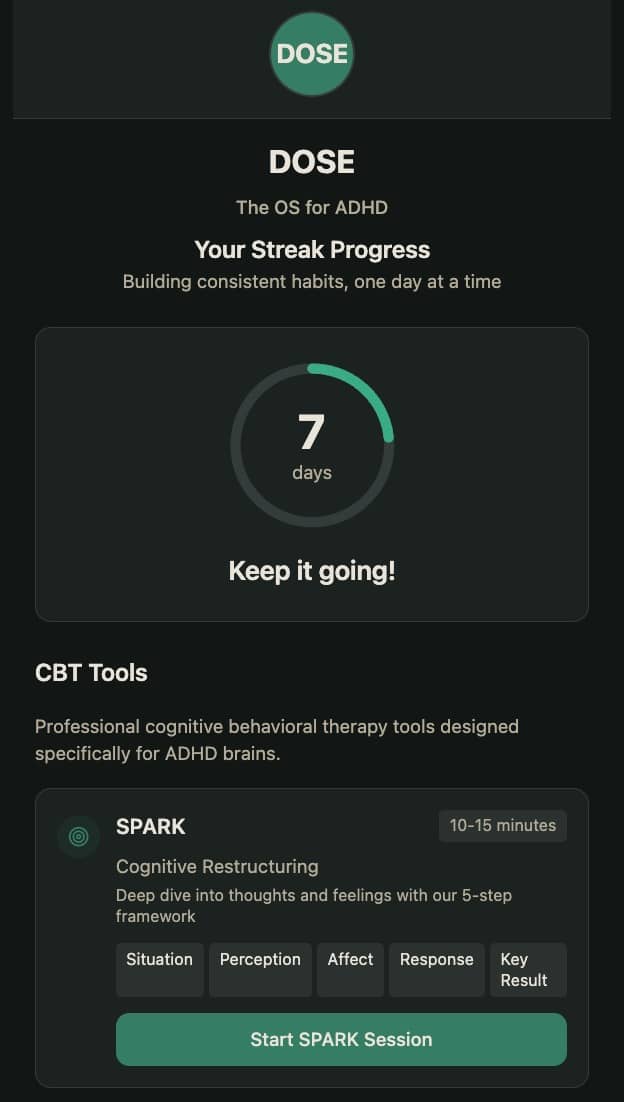 Meet DOSE, the first toolkit for the ADHD brain. Featuring strategic thinking tools, quick idea capture, and a first of it's kind RSD meter to make coping with rejection easier.